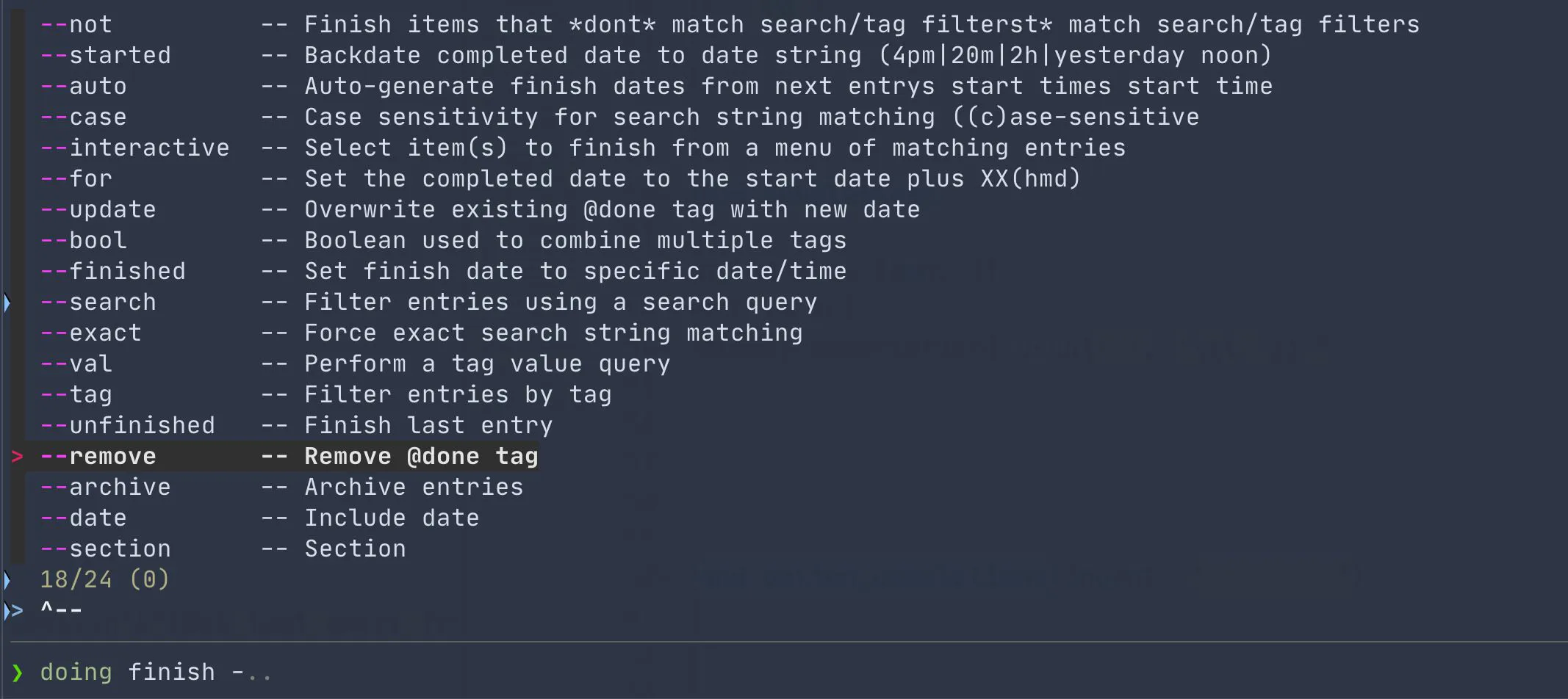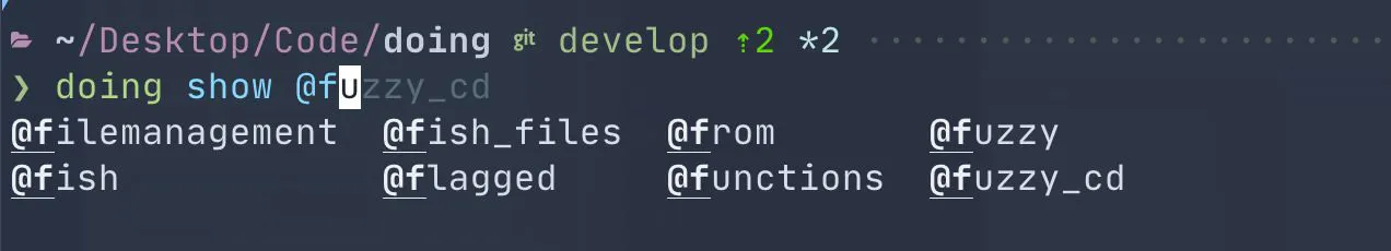 The shell completion scripts have improved, especially for Fish. (I put some more effort into Zsh, but I don’t use it regularly and I’m sure it could use further improvements. If you’re a Zsh pro and a Doing user, please feel free to create a GitHub Issue with any suggestions/fixes.)